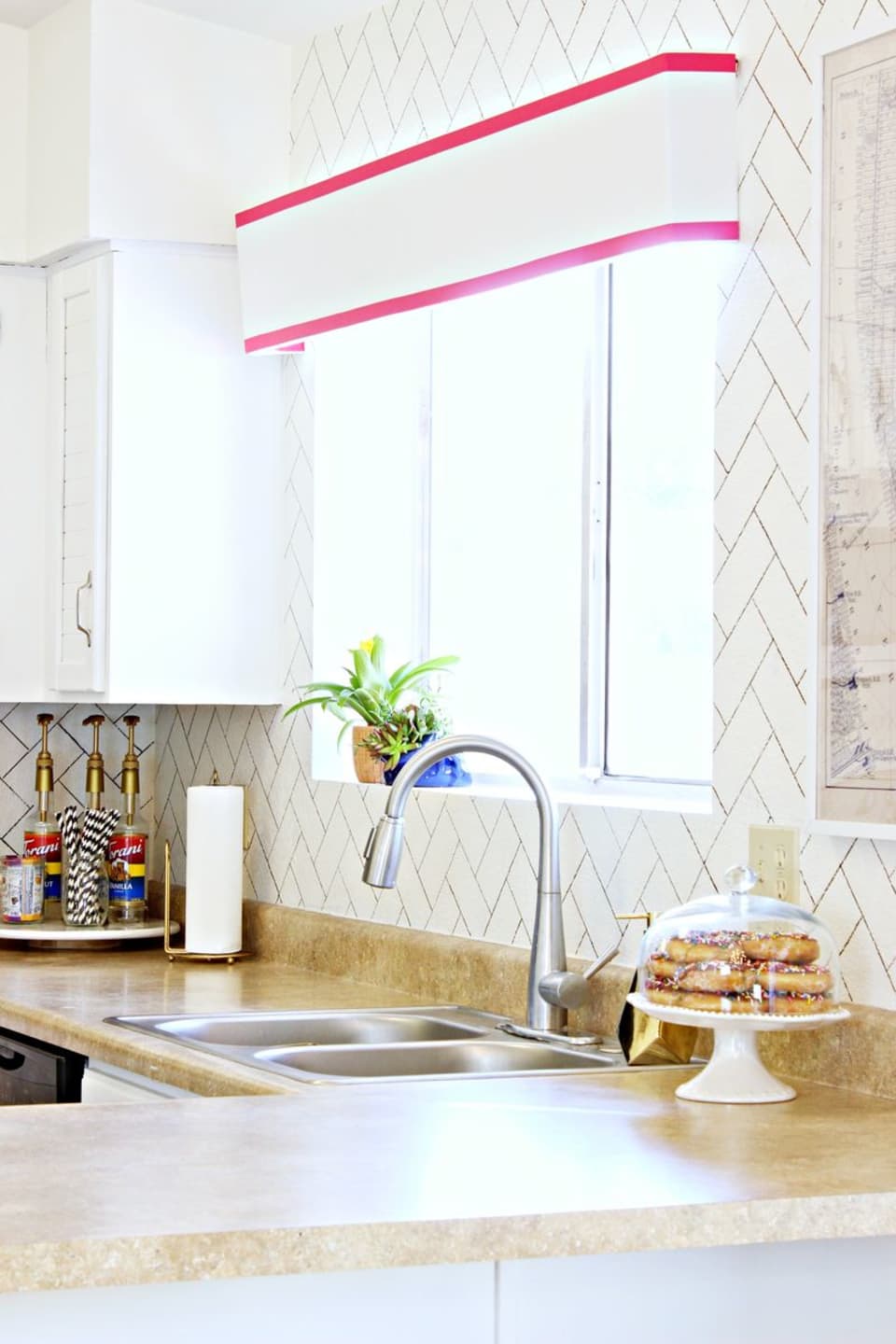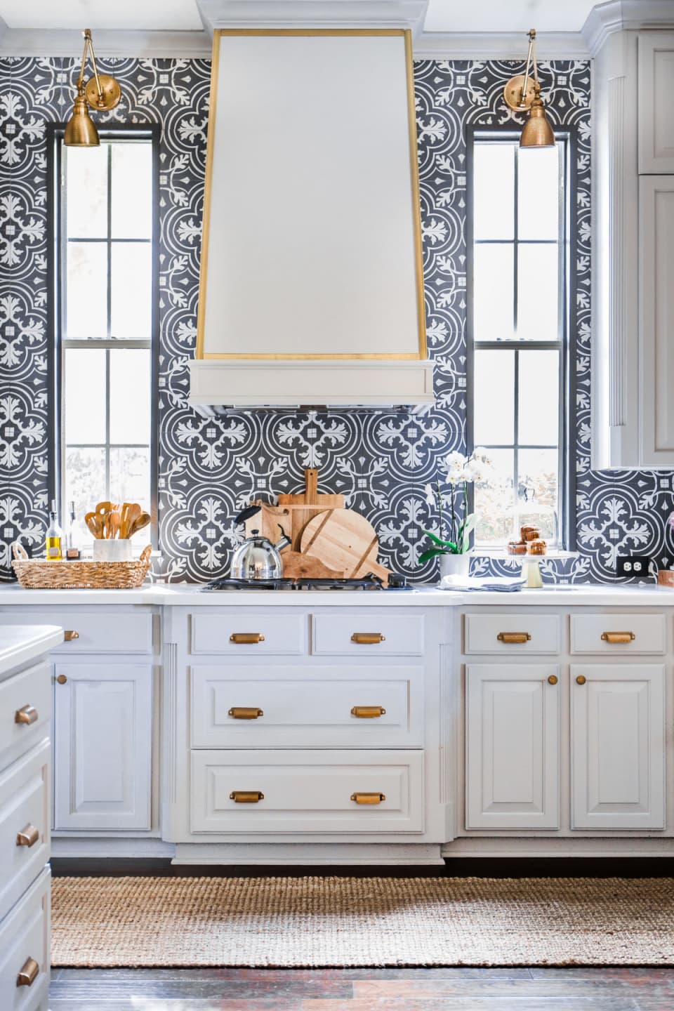 Do you still think that the kitchen baffle can only be white? Then you are probably wrong! This baffle is a blue and white pattern. Just like the Moorish murals, the white cabinets contrast with the striking blue kitchen backsplash.source